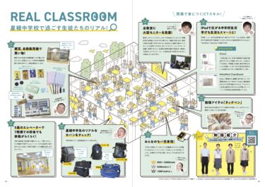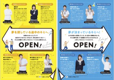 中学校版では中面に両観音開きを設け、情報をダイナミックかつ視覚的に展開することで、読み手に強い印象を与える誌面構成に。