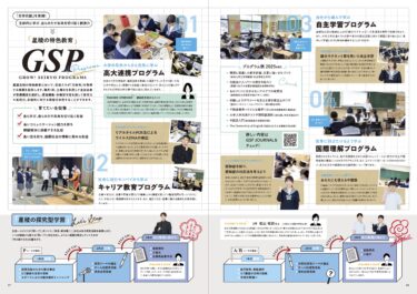 高等学校版では表紙の撮影イメージを中学校版と揃え、星稜全体の統一感を大切にしながら、さわやかな印象に仕上げました。表紙を開くと片観音開きで大きく展開し、校長先生と卒業生によるスペシャルインタビューを見開きで配置。力強いメッセージとリアルな体験談が響く構成としています。