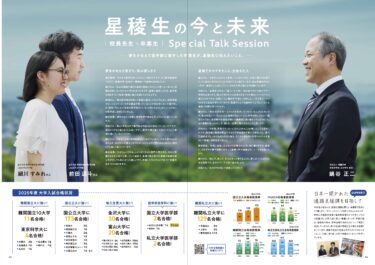 高等学校版では表紙の撮影イメージを中学校版と揃え、星稜全体の統一感を大切にしながら、さわやかな印象に仕上げました。表紙を開くと片観音開きで大きく展開し、校長先生と卒業生によるスペシャルインタビューを見開きで配置。力強いメッセージとリアルな体験談が響く構成としています。